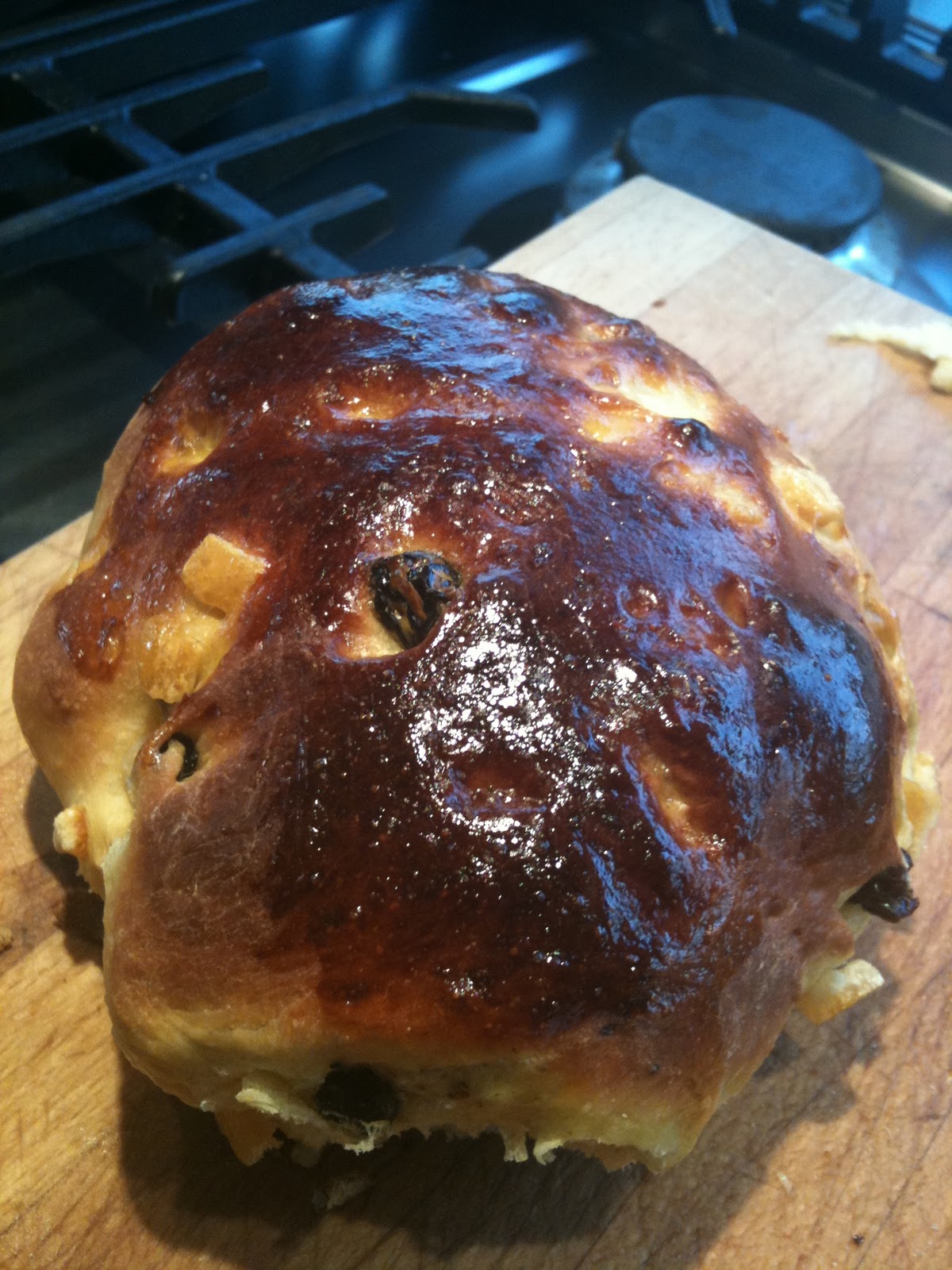 | A bun. This one from the first batch, thus without its top hat of crushed sugar cubes and amaretti biscuits, which I now regard as obligatory. |