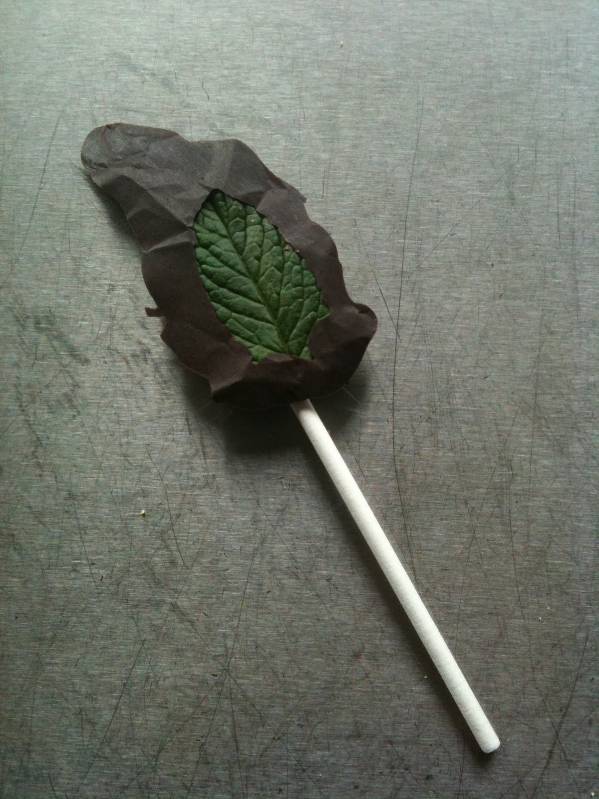 A mint leaf enrobed in dark chocolate atop a stick. Joy.