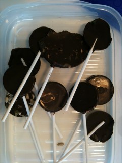 So I made some and they were great and so easy. There’s something about giving people a little chocolate something on a stick that makes them go crazy. (I got some mint leaves, melted some 70% cocoa chocolate, dripped it over the top and stuck a lollipop stick on, do the lot on some baking parchment, put in fridge for not very long at all, peel off, present with coffee.)