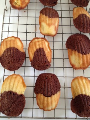 Into one of the halves half I drizzled the melted chocolate and stirred it well. I then dolloped a spoon of the chocolate mixture into my madeleine tray, a spoonful of the plain mixutre and cooked as above. Result: fantastic. The chocolately bit was really chocolately. I had worried it might alter the mixture in some way, but only for the better!