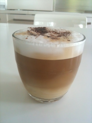 It comes in three sizes: 220ml, 160ml, 90ml. It’s the middle size you can see here and it is perfect for serving water, red wine (I really do not like traditional wine glasses, they make me hyperventilate, especially the ones we have which are on stems about a foot high and I always fear knocking them over because I am quite clumsy. My partner is rabid about serving wine in the correct way, at the correct temperature, in the correct glass and then you holding it in the correct way. Me? I drink the Italian peasant way, in a glass rough worker’s hands can pick up easily) or even, as you can see below, cappuccino. It holds, to my mind, the perfect proportions of a good cappuccino – not too much milk, one espresso shot.