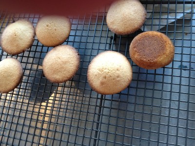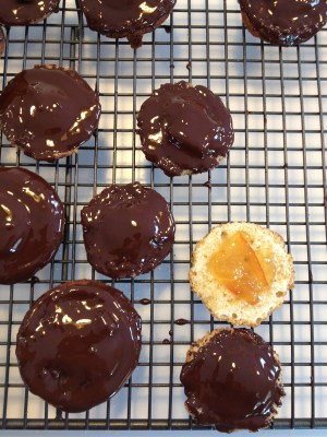 Melt the chocolate, with the orange zest and oil (oil not essential but gives a nice gloss), in a bowl over a pan of water. When melted, spoon over each marmalade covered sponge. What I did was put the cooling rack over a baking tray to catch any drips (ahem, I took it away for the photo below for better contrast), and then pick up each sponge and spoon the chocolate over, spreading it delicatedly with the back of the spoon – you don’t want to compromise the blobs of marmalade – then putting each back on the rack over the tray to catch any drips. And there were hardly any drips. I guess you could be more slap happy and just spoon the chocolate over each sponge whilst they’re sat on the rack and let the chocolate drip gaily.