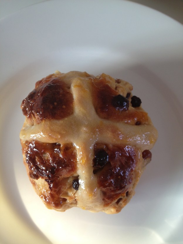 I have never made hot cross buns, but always wanted to. A few weeks ago, I spied a recipe in Waitrose magazine for Brandy-spiced hot cross buns (on the cover of the March issue if you fancy picking up a copy). The recipe is by someone called Lily Vanilli, I must confess I’ve never heard of her but will certainly look out for her things from now on as these turned out amazingly well. My partner gave a little whimper as he ate one, warm from the oven, split and buttered.