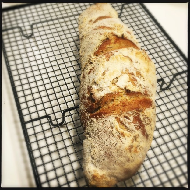 The one you see here suffered all sorts of indignities – I didn’t flour it, it was so stretchy I had to peel it off the planchette, it went into the oven full of injury and I didn’t hold out much hope for it. But sourdough is a miraculous thing and as forgiving as the best mother can be: 10 mins at 250C, 10mins at 220C and out it came: a perfectly wonderful loaf of bread, with an excellent crumb and a great taste.