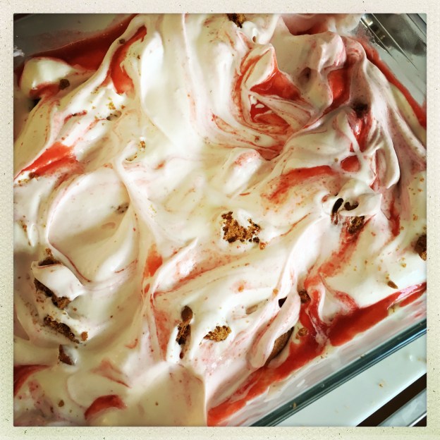 Get a suitable container which can go in the freezer (this makes about 2L I think), pour in half the ‘creamy’ mixture, then add half the strawberry mixture and mix around. You don’t want to mix it so much that it starts to resemble strawberry ice cream – you want a ripple. But avoid having great rivers of ripple. I did this the first time; you can see it in the picture, just a bit too much ripple, I mixed it a tad more second time round and it was better. It’s not wrong to have thick ripple, but the ripple part has a higher water content so is more icy in the mixture, which is more noticeable when the cream cheese/cream part is so utterly pillowy. Scatter over half the biscuits. Repeat for the next layer.