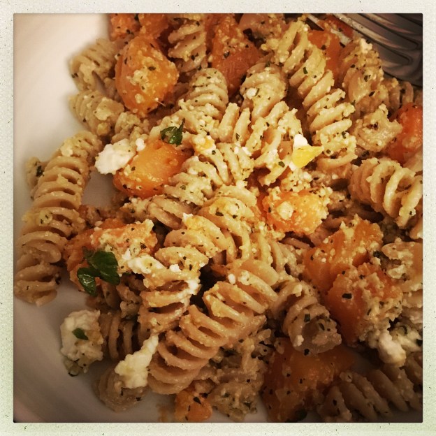 When pasta is cooked, drain but reserve the cooking water – about a cup full, add that slowly to the pesto until you have a looser mixture – you may need less. Reintroduce the pasta to the pan (off the heat), stir through the pesto, scatter atop the sweet potato and serve in a big dish with scattered, crumbled, feta.