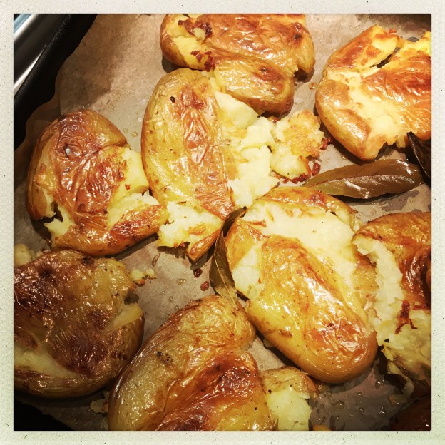 Because, unlike with roasties, you don’t have to worry about breaching the crispiness, these lend themselves particularly well to meals where there’s juice or gravy to mop up. That said, the smashing does give these potatoes bits to delightfully crisp up. I originally got this from Delicious magazine.