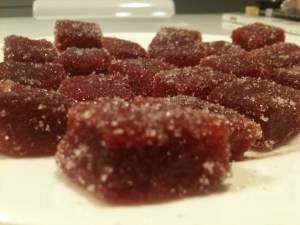 | Fruit pastilles or pate de fruit. Not chewy, just soft set jellied sweets. Mmmm. |