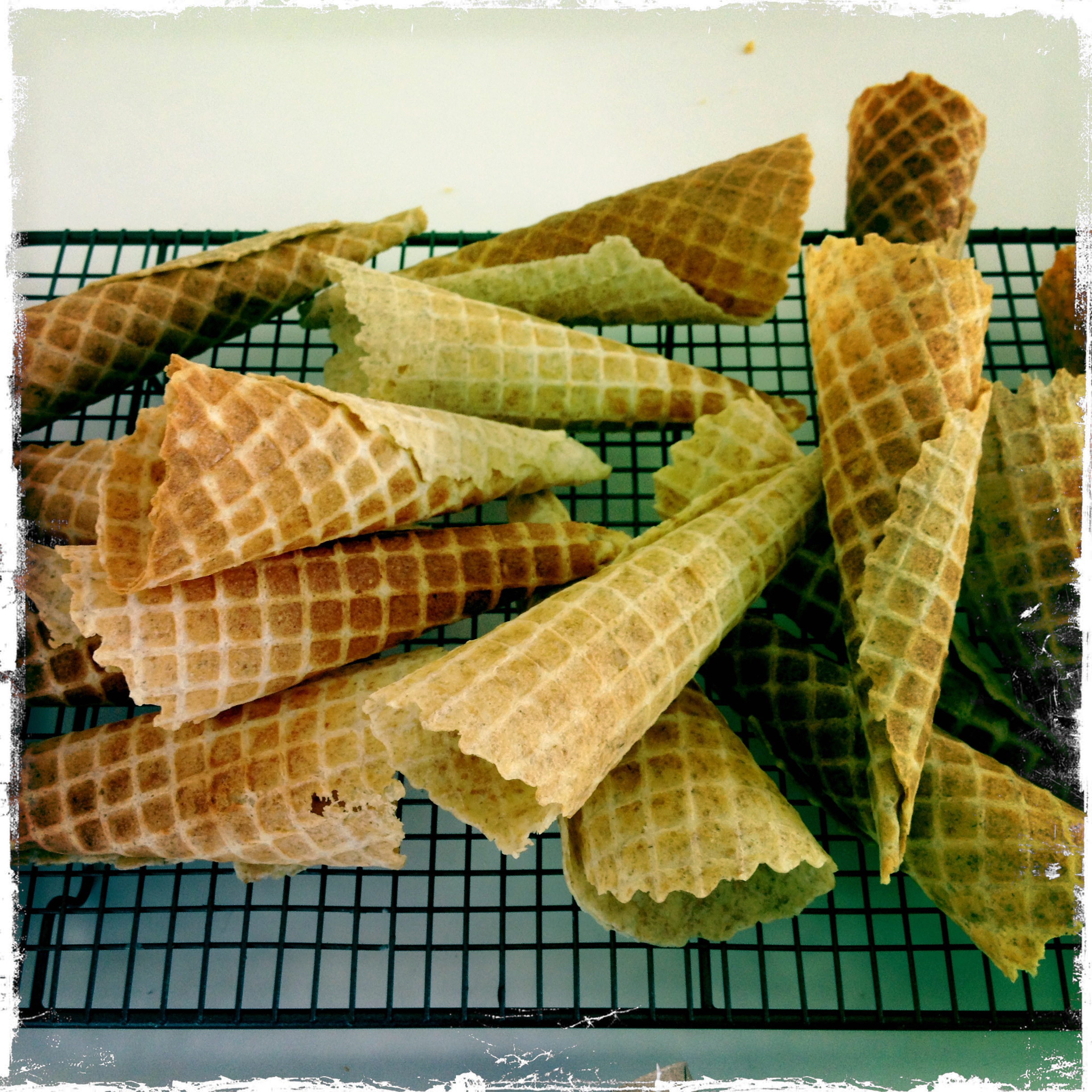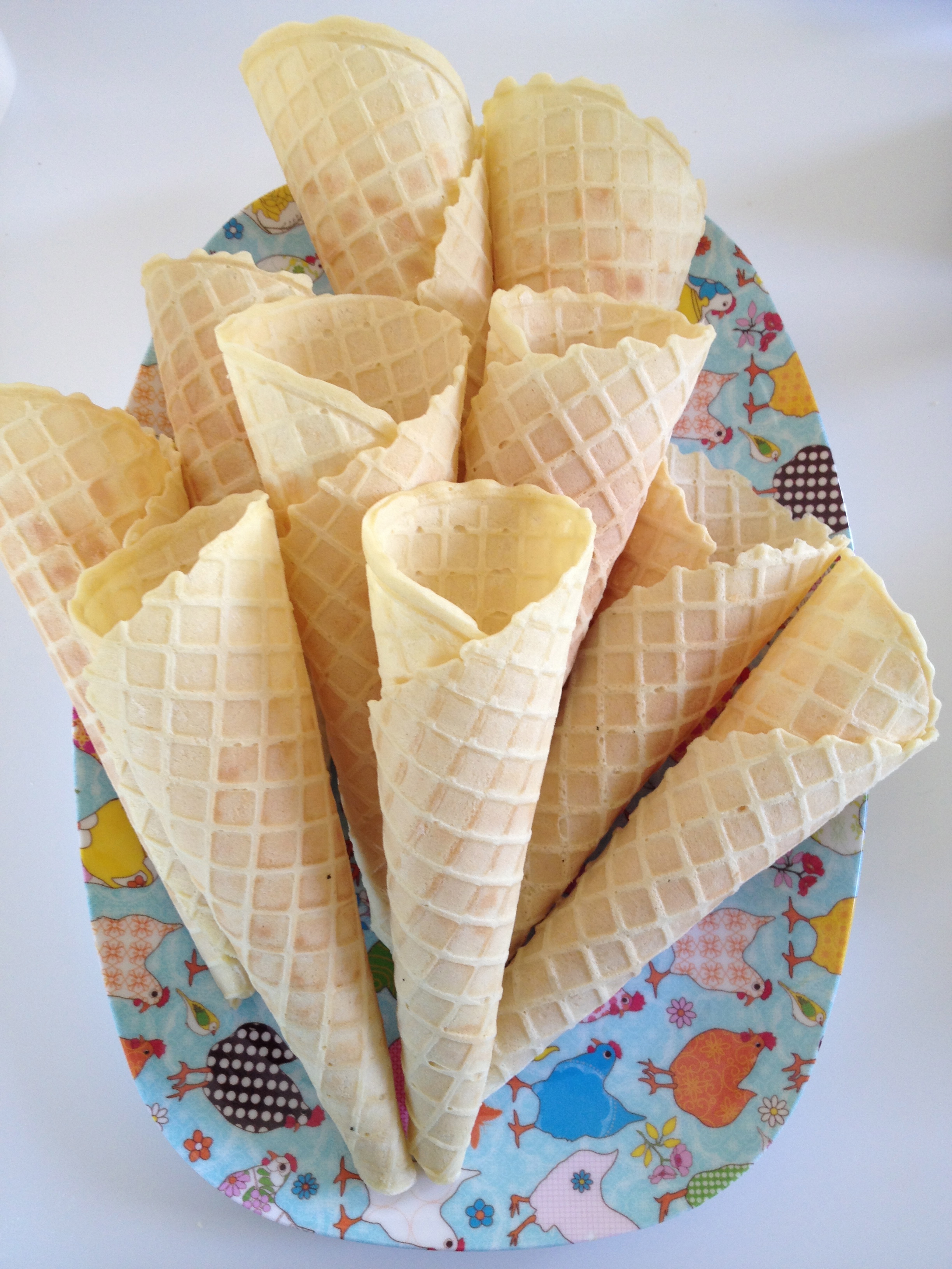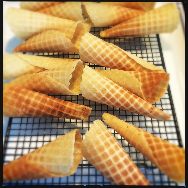 So, ice cream cones. What, you may be thinking, is the figging point of making your own? Well, you may live somewhere where you can easily buy those nice sugar cones. I don’t. And last year my local supermarket, Waitrose, seemed to have a run on decent ice cream cones and for weeks and weeks all you could get were a) awful wafer cones or b) awful wafer cones in the shape of a teddy’s head. This is very serious when you are an ice cream maker’s daughter. You cannot serve good gelato in such a receptacle.