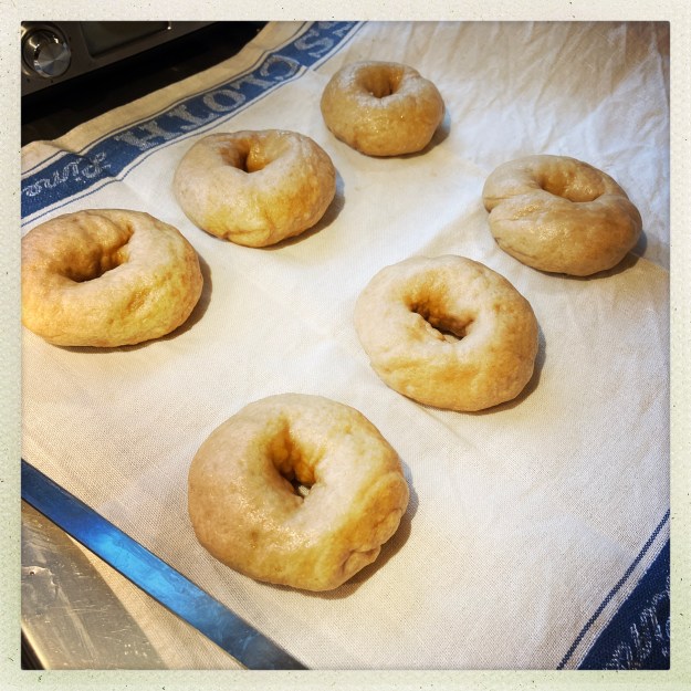 I tend to shape these into little round rolls first and then puncture a hole with a wood spoon handle. I tend to make these with a smaller hole than my yeasted bagels. Who knows why.