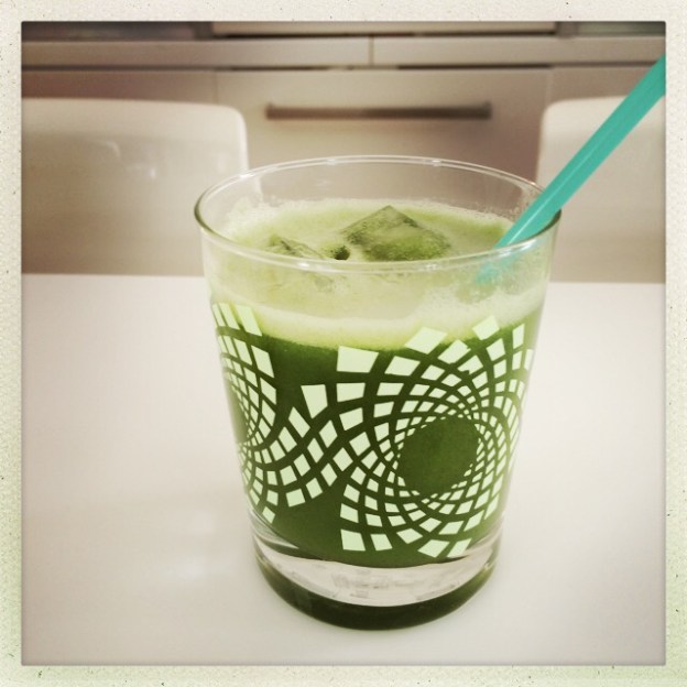 Put all the ingredients in a blender/Nutribullet and taste it: because lime sizes vary and the recipe isn’t precise, you may need to add that date, or a bit more apple juice or water or cucumber. The ginger and mint are strong tastes, the cucumber calms it all down, the apple juice adds liquid and sweetness.