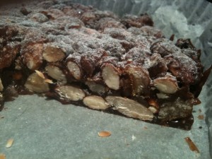 Well, it was a revelation. It is easy to make, although the ingredient list is not short (or cheap, what with the price of nuts these days). It is delicious, but not in that “I must eat more and more and more until I’m sick” way. A thin slice with a glass of something small, and pert, is perfect. It keeps – so it can be made before Christmas (I’m not going to say “ahead of” since I HATE THAT PHRASE. What happened to ‘before’? It is being outsted). And a thick wedge, wrapped in cellophane would make for a really original little present for a host.